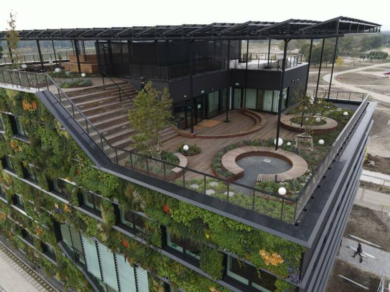 Vorige maand zijn er weer foto's genomen met een drone van ons prachtige schoolgebouw. In deze reeks zie je prachtig ons groene belevingsdak en groene wanden. Maar ook de zonnepanelen die ons gebouw van duurzame stroom voorziet.