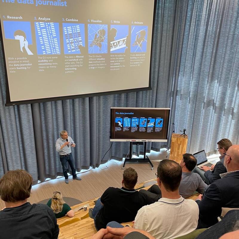 De studenten organiseren zelf de logistiek, het ontwerp, de technische ondersteuning en het programma. Zo namen moderatoren Isabella en Tom de deelnemers mee in verschillende perspectieven op “GeoData is de Toekomst”. Sprekers tijdens deze dag: Gideon Spanjar, Lector Aeres Hogeschool; André Nagelhout, Aerovision; Emma Roggen, Gemeente Almere; Frédérik Ruys, Vizualism, Geo-dataspecalist/webcartographer. Nieuw dit jaar: een groep studenten presenteerden een eigen startup en vroegen feedback aan het on campus en online publiek.